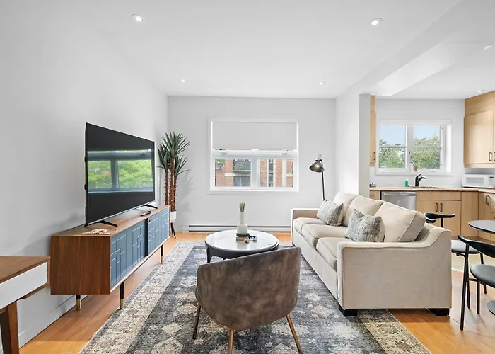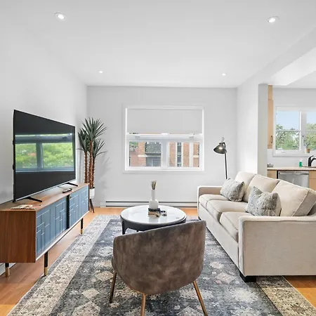 Situated within 5 minutes' walk of Eglise Sainte-Cecile, the 1000 m² Trendy 2-Bedroom Haven By Jean Talon Market offers proximity to various nearby tourist attractions.